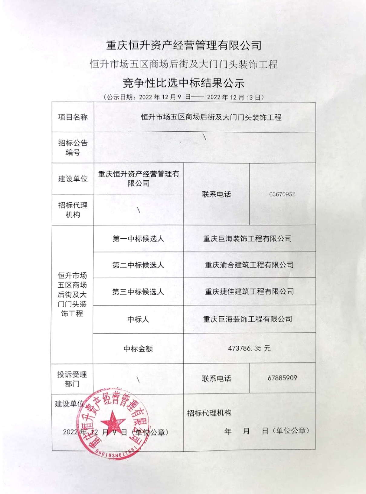 结果公示:重庆恒升资产经营管理有限公司 恒升市场五区商场后街及大门门头装饰工程 竞争性比选中标结果公示