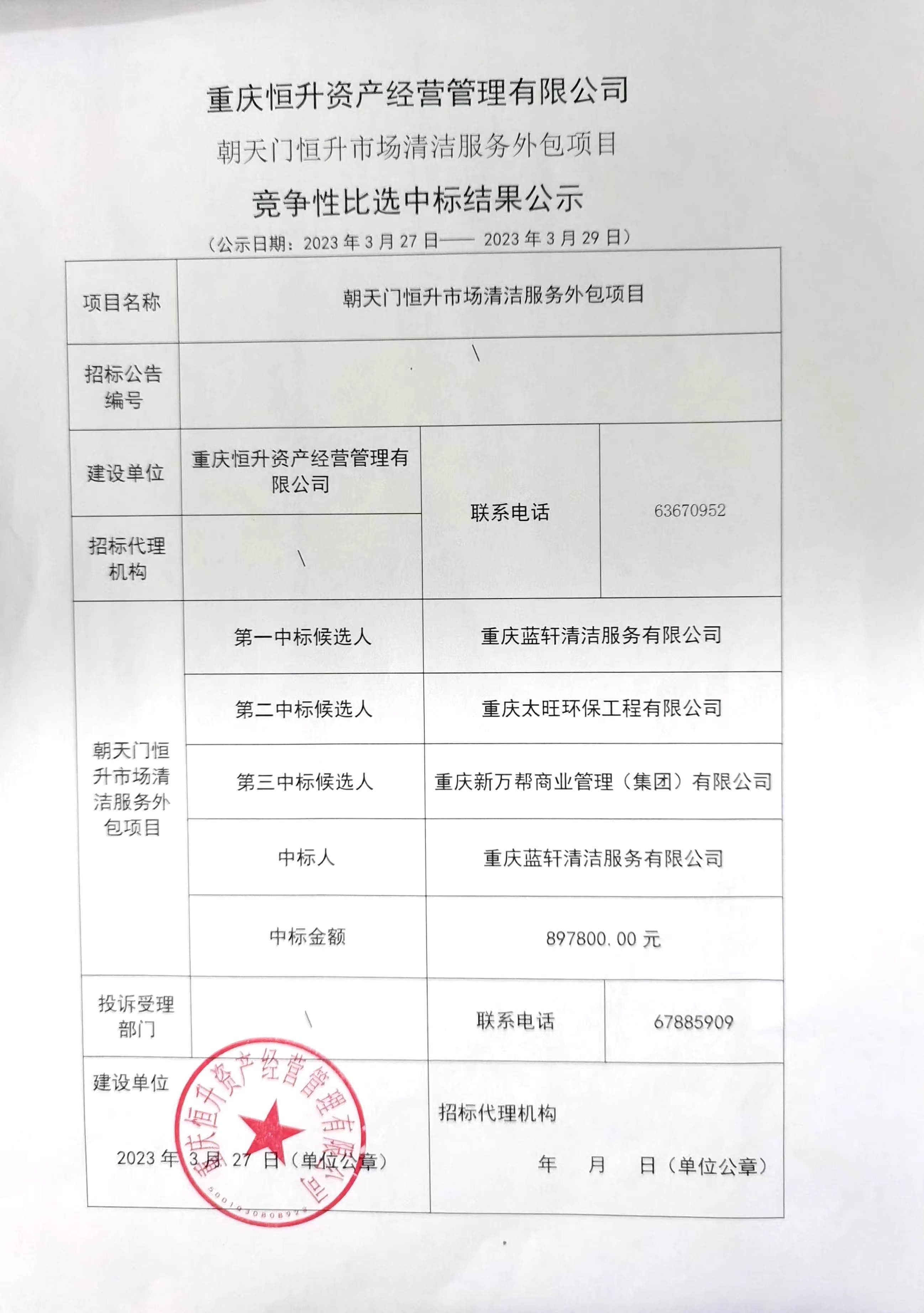 结果公示:重庆恒升资产经营管理有限公司 朝天门恒升市场清洁服务外包项目 竞争性比选中标结果公示