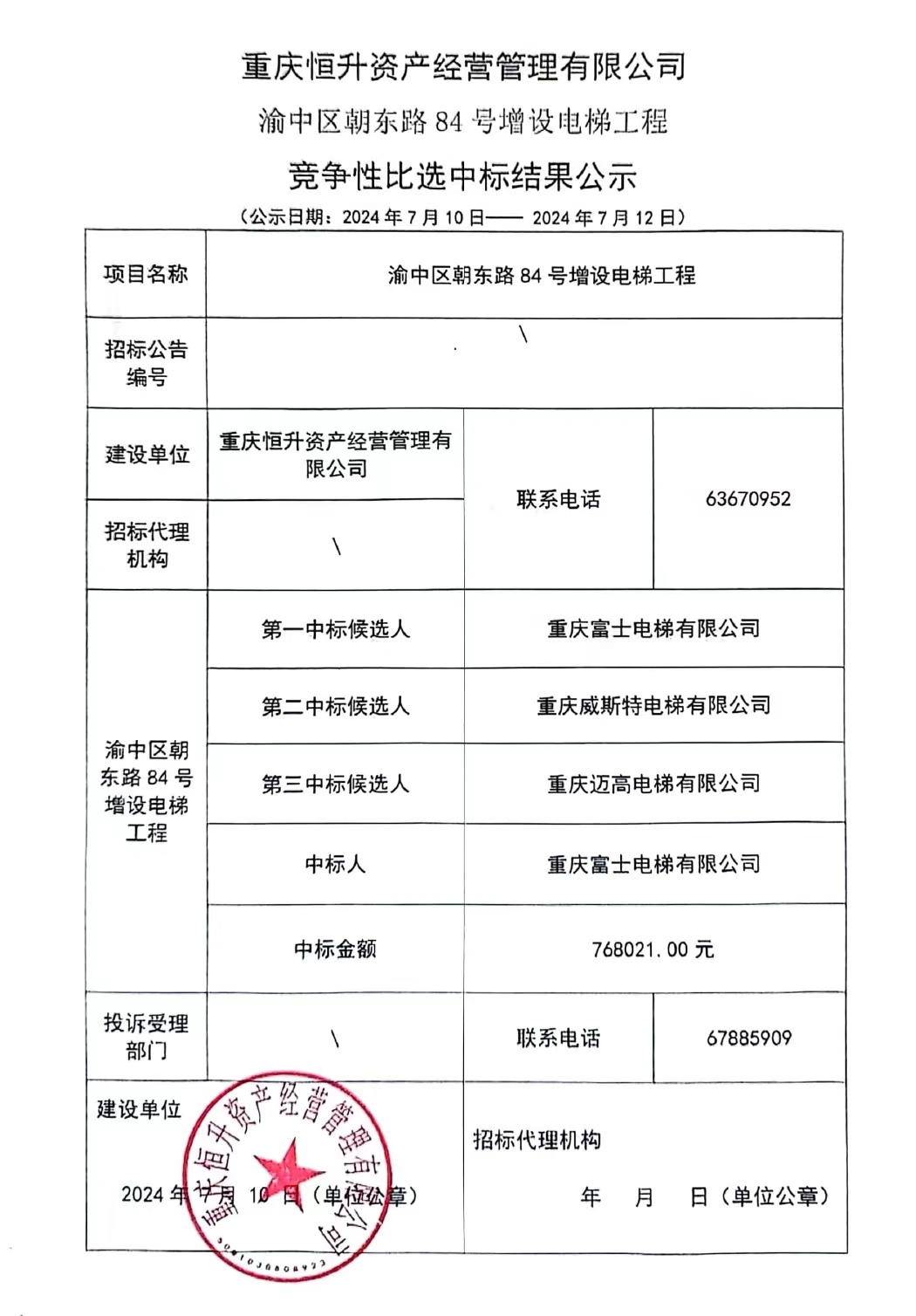 结果公示:重庆恒升资产经营管理有限公司 渝中区朝东路84号增设电梯工程竞争性比选中标结果公示
